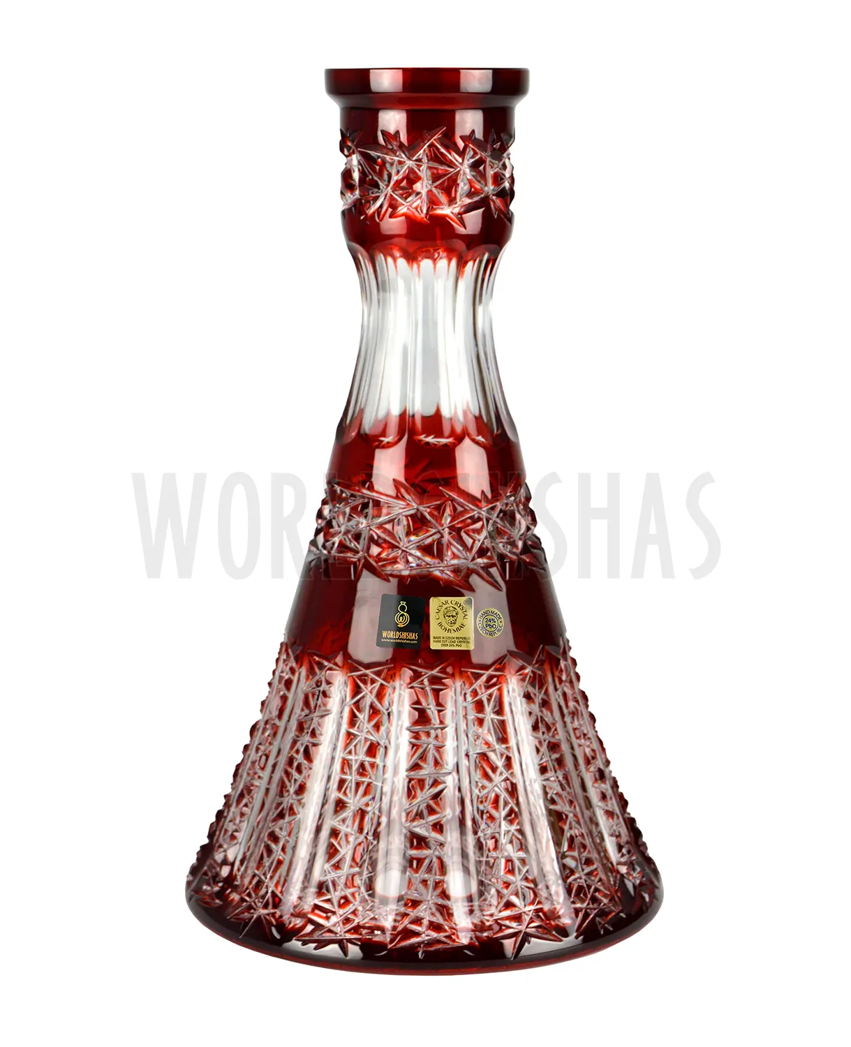 Cada base se elabora de forma artesanal en Bohemia, República Checa, utilizando la técnica del soplado a mano, lo que garantiza un acabado único e irrepetible en cada modelo. Su composición contiene un 24% de PBO (óxido de plomo), responsable del característico destello y de la espectacular dispersión de la luz que distingue al cristal de Bohemia. El resultado es una base que combina resistencia, estética y un brillo incomparable, perfecta para quienes cuidan hasta el último detalle de su cachimba.