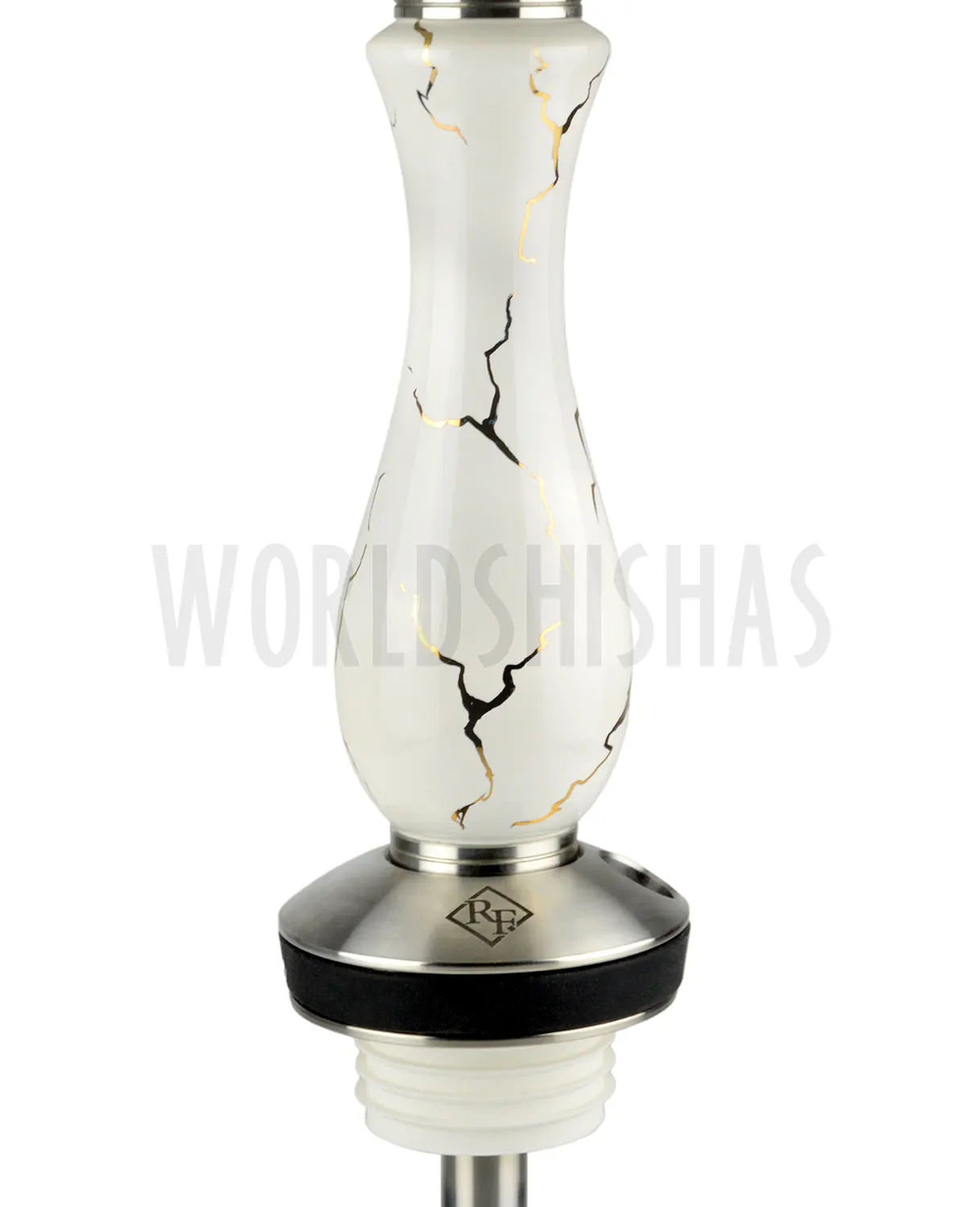 La RF Hookah Lightning está construida íntegramente en acero inoxidable V2A, ofreciendo resistencia, durabilidad y excelente comportamiento frente a la humedad. El mástil incorpora un embellecedor de resina artesanal decorada con pan de oro, que aporta elegancia, brillo y un acabado único en cada pieza. La boquilla mantiene la misma estética del mástil, creando un conjunto uniforme y sofisticado.